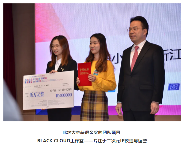 憑借超力強(qiáng)的實(shí)力水準(zhǔn),最終,程佳瑩、高田曜、王涵譽(yù)、黃雯靜、丁綺、柯銘穎團(tuán)隊(duì)的項(xiàng)目《BLACK CLOUD工作室——專注于二次元IP改造與運(yùn)營》榮獲本次大賽的金獎(jiǎng),并領(lǐng)取了5萬元參賽獎(jiǎng)金。