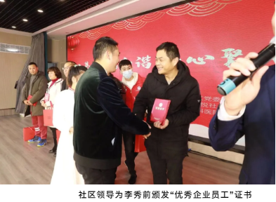 隨著晚會的高潮出現(xiàn),激動人心的頒獎環(huán)節(jié)也開始了。晚會對在疫情防控、文明創(chuàng)建、攻堅克難任務中甘于奉獻、勇于擔當?shù)钠髽I(yè)先進工作者、優(yōu)秀志愿者、優(yōu)秀居民代表、網(wǎng)格標兵、最具工匠精神者、傳承風尚者予以表彰!值得一提的是,“雙童”員工李秀前被授予了“優(yōu)秀企業(yè)員工”榮譽稱號。