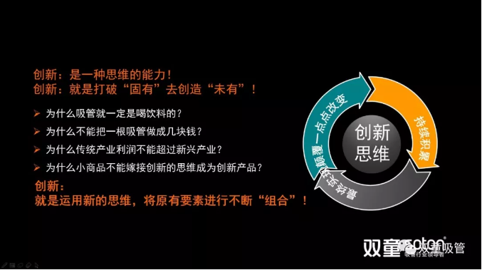 現(xiàn)在,不少人動不動就喊要創(chuàng)新,但是到底什么是創(chuàng)新?我一直理解創(chuàng)新工作的本質(zhì)在于“思維創(chuàng)新”,就是運(yùn)用新的思維,將原有要素進(jìn)行不斷“組合”,打破“固有”創(chuàng)造“未有”。只有用創(chuàng)新思維去做產(chǎn)品、做事業(yè),才能改變自己乃至于整個(gè)企業(yè)的命運(yùn)!