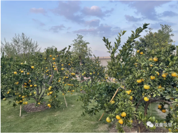 為了“雙童”的生態(tài)和美觀,公司明確柚子是觀賞性水果。成長過程中柚子可以一直掛在樹上觀賞一直到第二年四月,六月份開始新的柚子又長成了,一年掛果十個(gè)月!每棵柚子樹上都有“觀賞水果,請勿摘食”的字樣,提醒和引導(dǎo)員工不要摘食觀賞水果。