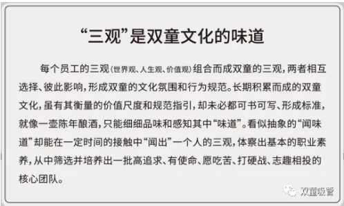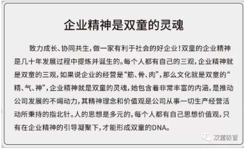 企業(yè)文化是在長(zhǎng)期的經(jīng)營(yíng)活動(dòng)中形成的,是對(duì)企業(yè)成長(zhǎng)環(huán)境、能力、經(jīng)驗(yàn)的歸納與變革,伴隨著企業(yè)的歷史而生。那么“雙童”的企業(yè)文化是如何傳承和進(jìn)化的呢?