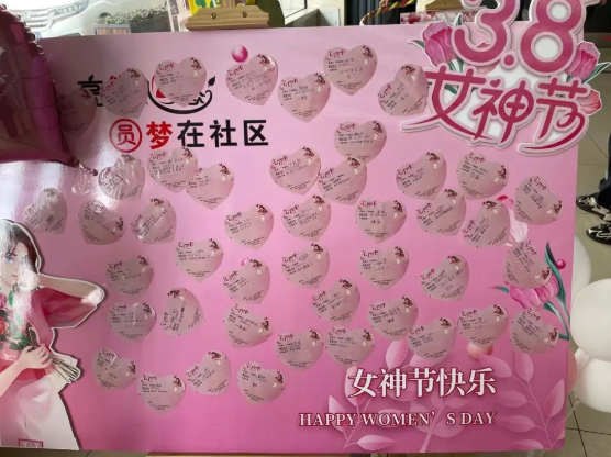 進門就可以看到一張展板,上面寫著“圓夢在社區(qū),女神節(jié)快樂”的字樣。展板上貼滿了女神們的小心愿,她們每個質樸的心愿都值得被珍藏,每一份真誠的祝福都為婦女節(jié)這個特殊的節(jié)日增光添彩。
