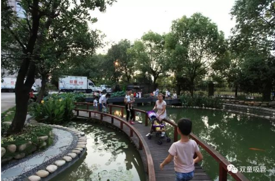 在一天忙碌的工作結(jié)束后,“雙童”人喜歡漫步在九曲橋邊,家屬們也常常帶著孩子來這里乘涼聊天,湖邊河卵石的小路上到處坐滿了人,這里的好風(fēng)光給大家?guī)砹藵M滿的幸福感!