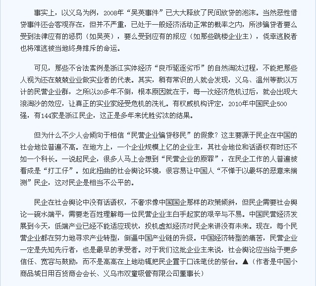 所謂“假破產(chǎn)真移民”,在義烏乃至全國(guó)都是極少的案例。我們不能以個(gè)案就把所有移民企業(yè)主都“妖魔化”,更不能用偶發(fā)事件誤導(dǎo)讀者與社會(huì)輿論,進(jìn)而虛構(gòu)整個(gè)義烏乃至浙江的企業(yè)都“試圖騙貸外逃”的假象。