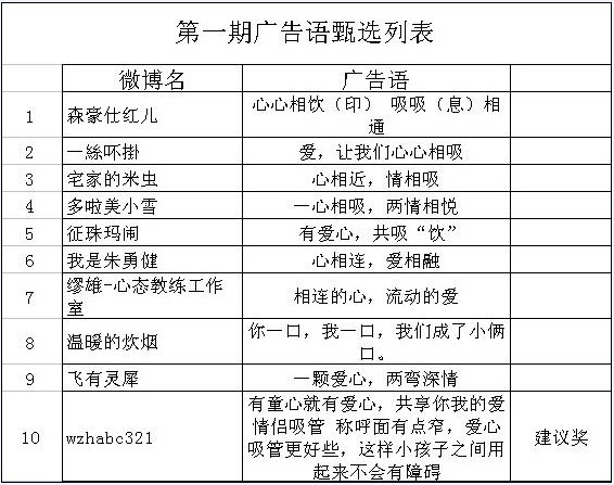 本期投票活動(dòng)是6月11-15日開展的第二期“愛心吸管”廣告語(yǔ)征集活動(dòng)的一個(gè)延續(xù),活動(dòng)將在第二期甄選的優(yōu)秀廣告語(yǔ)中由網(wǎng)友投票選擇出最佳廣告語(yǔ),獎(jiǎng)品設(shè)置如下: