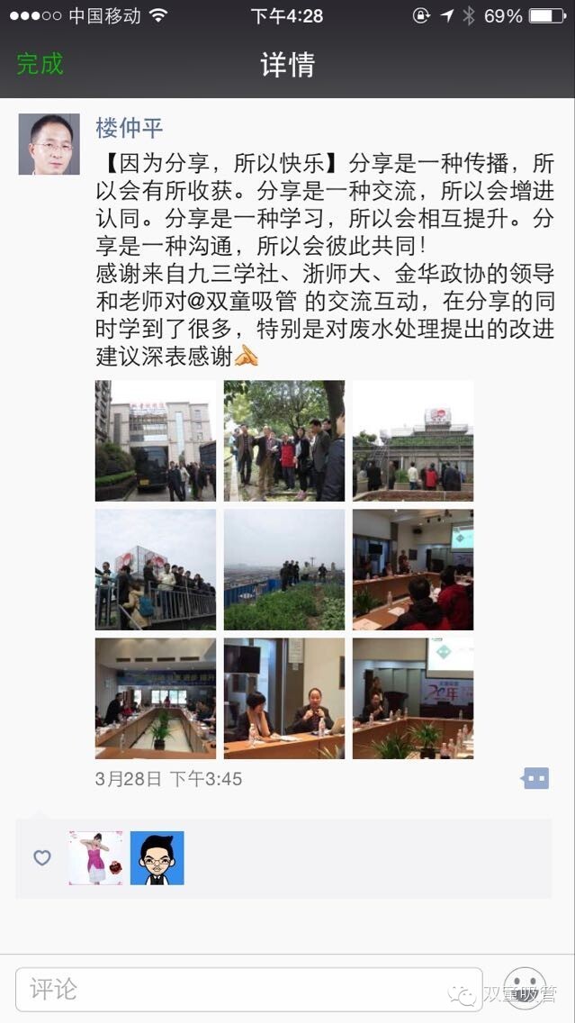 當(dāng)家人在朋友圈里發(fā)了感慨:分享是一種傳播,所以會(huì)有所收獲。分享是一種交流,所以會(huì)增進(jìn)認(rèn)同。分享是一種學(xué)習(xí),所以會(huì)相互提升。分享是一種溝通,所以會(huì)彼此共通!感謝來(lái)自九三學(xué)社、浙師大、金華政協(xié)的領(lǐng)導(dǎo)和老師對(duì)@雙童吸管 的交流互動(dòng),在分享的同時(shí)學(xué)到了很多,特別是對(duì)廢水處理提出的改進(jìn)建議深表感謝!
