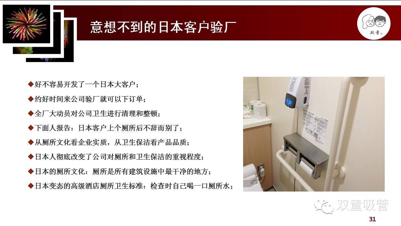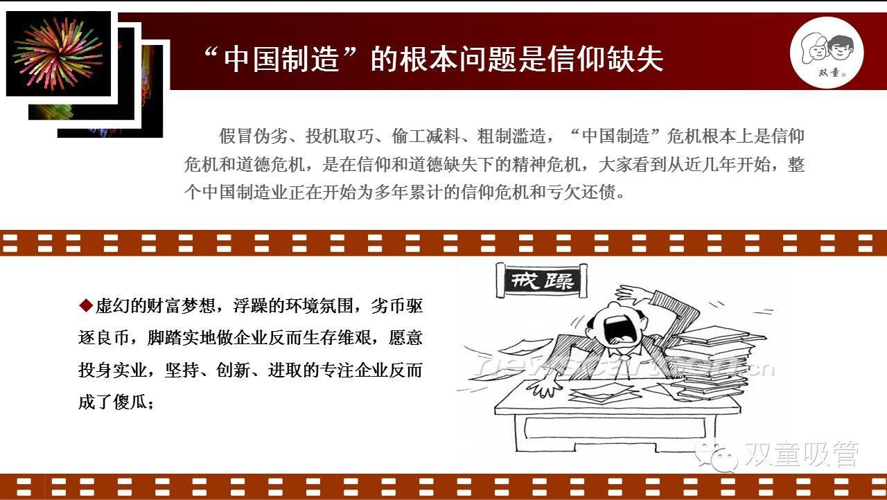 最后的第三部分,自然是課程的重中之重。董事長(zhǎng)賣了這么久的關(guān)子,又是講大環(huán)境又是講企業(yè)發(fā)展和企業(yè)文化,終于還是繞到了“產(chǎn)品質(zhì)量”這個(gè)話題上來(lái)!在講述了雙童數(shù)次和日本客戶打交道之后的故事之后,他引用了陳春花的話說(shuō)明質(zhì)量的重要性:淘汰企業(yè)的一定不是企業(yè)的規(guī)模、不是企業(yè)的技術(shù)、不是企業(yè)的品牌、也不是產(chǎn)品的價(jià)格。淘汰企業(yè)出局的一定是企業(yè)的顧客!唯有顧客才能決定企業(yè)是否能夠繼續(xù)生存!
