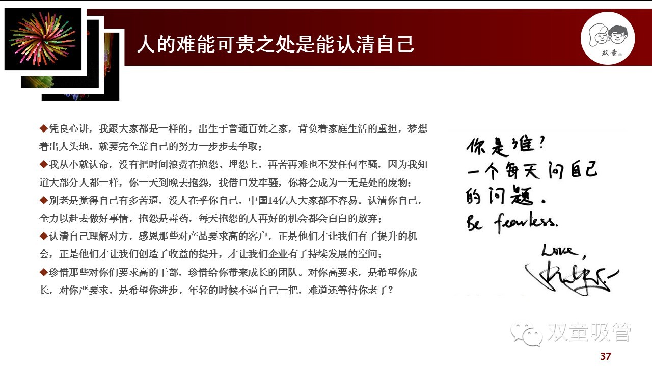 第二部分,董事長(zhǎng)延伸到了我們雙童吸管的企業(yè)文化,向員工們講起了他的創(chuàng)業(yè)經(jīng)歷和管理雙童以來(lái)發(fā)生的一些故事。他說(shuō),無(wú)論是現(xiàn)場(chǎng)管理還是質(zhì)量管理,說(shuō)白了都是“人心管理”,唯有把人“心”管住了,所有問(wèn)題才能逐項(xiàng)解決。當(dāng)然人“心”最難管,需要恒心,需要耐心,需要看的長(zhǎng)遠(yuǎn)做更多善待員工的利他之心。