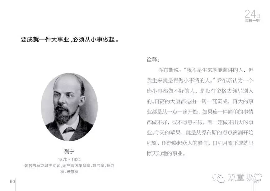 這本《每日一則》里,共收錄了31句名人經(jīng)典語(yǔ)錄,包含了專注、創(chuàng)新、共贏、正氣等主題的內(nèi)容。在每一句名言下,還有當(dāng)家人樓總親筆做出的名言詮釋,力求精煉簡(jiǎn)介,直達(dá)人心!這項(xiàng)工作可是“折磨”了當(dāng)家人一段時(shí)間呢!