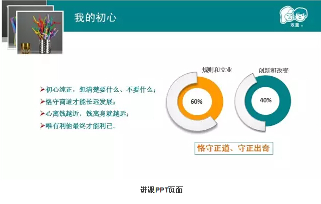 樓總認(rèn)真地準(zhǔn)備了PPT,講述了他的“匠人”之心。從早期創(chuàng)業(yè)過(guò)程的搖擺不定談到雙童吸管發(fā)展的堅(jiān)定;從開(kāi)始的規(guī)?;笈可a(chǎn)講到差異化和品牌化經(jīng)營(yíng),從小商思維談到經(jīng)營(yíng)哲學(xué);他回顧了雙童吸管二十多年的發(fā)展歷程,講到了他所推崇和堅(jiān)持的“三心”,也道出了吸管大王背后的堅(jiān)守和追求。