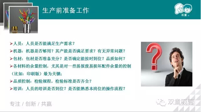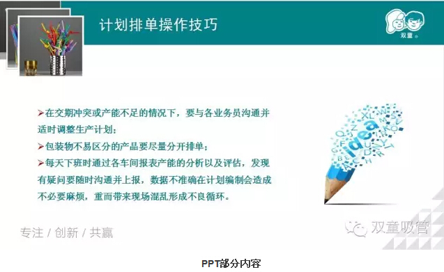 “雙童”堅(jiān)持“小客戶原則以來,每天車間的訂單都不少于200單,如何協(xié)調(diào)好這些單子,對生產(chǎn)計(jì)劃主管來說是一個(gè)大挑戰(zhàn)。張講師從生產(chǎn)計(jì)劃的作用,生產(chǎn)計(jì)劃的三要素,計(jì)劃工作的原則等方面闡述了生產(chǎn)計(jì)劃的重要性。那么,生產(chǎn)計(jì)劃的流程是怎樣的呢?生產(chǎn)計(jì)劃的注意事項(xiàng)及方法又有哪些呢,妞就放上我們講師的PPT和大家一起分享吧!