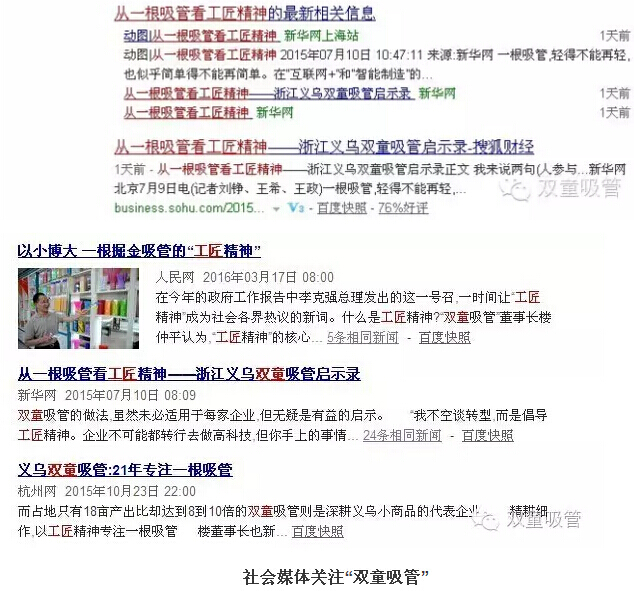 確實(shí),近兩年,“雙童吸管”不斷地被新華社、人民網(wǎng)等各大媒體作為“工匠精神”的代表企業(yè)推到臺前,我們也深受鼓舞,就像當(dāng)家人樓總所說,我們一定要把產(chǎn)品做成“精品”,企業(yè)才有將來!下面,就請大家和吸管妞一起來看看這一篇精彩的文章吧!