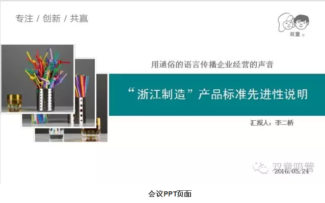 會議中,“雙童”董事長樓仲平向各位領(lǐng)導(dǎo)闡述了“雙童”一直以來對標準化工作的重視,并是目前浙江省唯一由單一企業(yè)承擔行業(yè)標準、國家標準和國際標準起草編制任務(wù)的中小企業(yè)??偨?jīng)理李二橋則詳細地向各位領(lǐng)導(dǎo)介紹了聚丙烯吸管的標準初案、編制說明(包括標準對比、分析、驗證、說明材料)及先進性介紹。