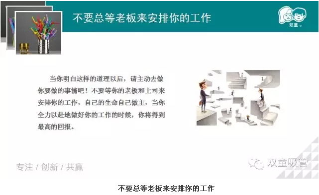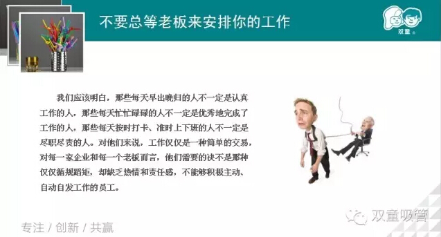 接下來,李講師又從不要總等老板來安排你的工作進行講解。是啊!我們應該主動去做事情,而不是等你的老板和上司來安排你的工作。