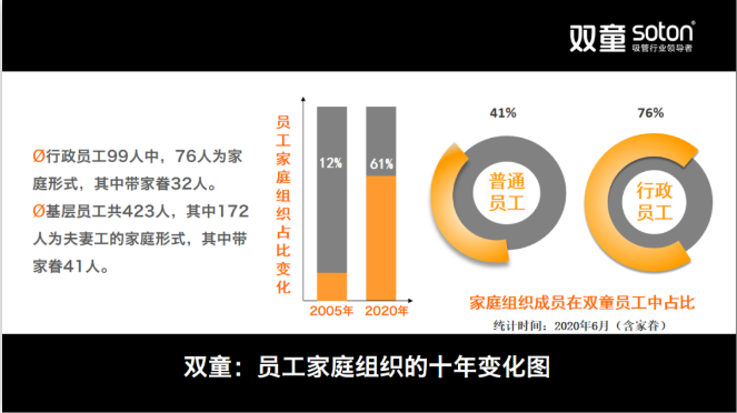 雙童早期團(tuán)隊(duì)的很多成員,都是在公司內(nèi)部找到自己的人生伴侶,生兒育女、組成一個(gè)個(gè)小家庭,逐漸形成雙童特色的“家文化”。在這樣的企業(yè)文化下,很多員工早已把公司當(dāng)成了“第二個(gè)家”。