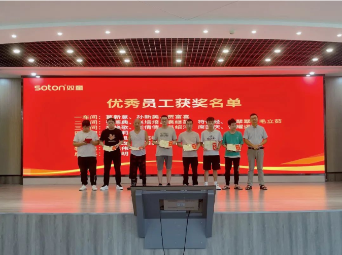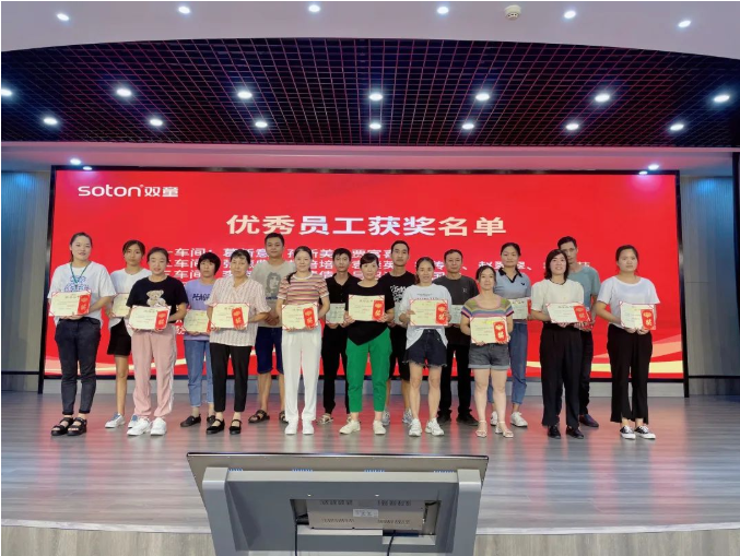 大會(huì)的第一項(xiàng)議程就是優(yōu)秀員工表彰,在第二季度中共23名一線員工脫穎而出,他們之中,有剛?cè)霃S工作時(shí)間不長(zhǎng)的新人、有在一線耕耘良久的“老兵”、還有后勤普通的食堂幫工……但他們有一個(gè)共同的標(biāo)簽:勤勤懇懇的“雙童”人!