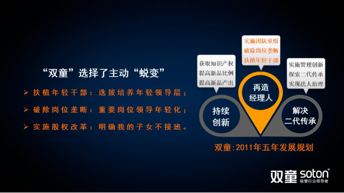 2010年前后,大部分管理層由于年齡偏大,逐漸難以適應(yīng)數(shù)據(jù)化環(huán)境帶來的挑戰(zhàn),管理上創(chuàng)新不足,奮斗意識開始持續(xù)下降,“雙童”因此選擇主動(dòng)“蛻變”,調(diào)整管理人員結(jié)構(gòu),并在組織關(guān)系原則中明確有血緣關(guān)系的直系親屬不得進(jìn)入管理層,作為巨變時(shí)代下的自救手段。