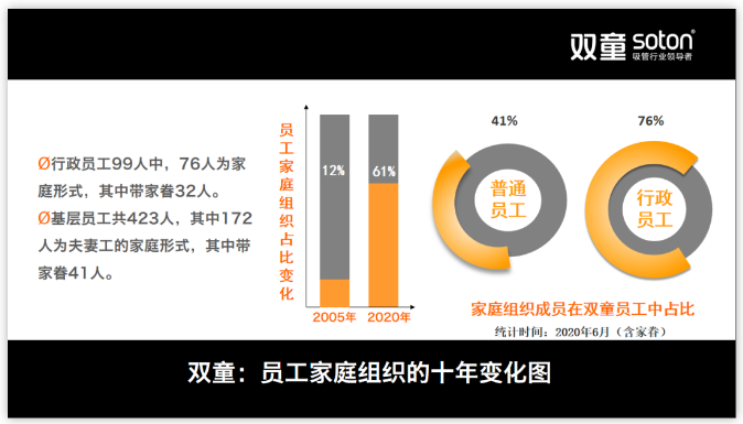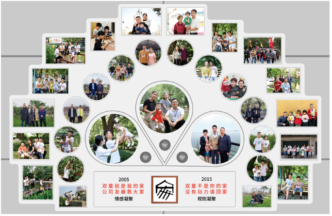 雙童早期團(tuán)隊的很多成員,都是在公司內(nèi)部找到自己的人生伴侶,并生兒育女、組成一個個小家庭,逐漸形成雙童特色的“家文化”。在這樣的企業(yè)文化下,很多員工早已把公司當(dāng)成了“第二個家”。生活在“雙童”大家庭的一個個小家