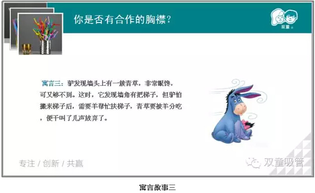 “驢吃不到青草,因?yàn)樗鼪]有合作的胸襟,我們應(yīng)該有合作的胸襟,俗話說合作才能雙贏嘛"!美女說的很簡練,卻把故事蘊(yùn)含的道理都點(diǎn)透了!看來我們的童鞋們都很有想法呢!