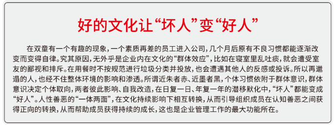在“雙童”諸如此類的事情,其實還有很多。組織文化對員工心性的影響是直觀且深遠的,“文化文化,文以化之”,組織文化的最終效用在于一個“化”字,也就是在于讓正確的文化理念成為員工個人內心深處的“信念”,并自覺地去執(zhí)行貫徹。