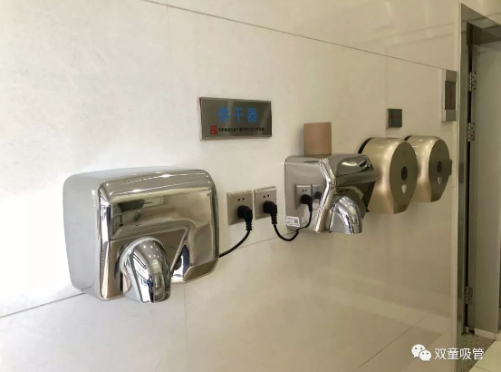 “雙童”每個(gè)洗手間的格局分明,除了男女衛(wèi)生間外,還設(shè)置了公共洗手區(qū)、烘干區(qū)、手紙區(qū),配置十分齊全。進(jìn)入衛(wèi)生間前,員工可以在手紙區(qū)取紙巾。洗手后,還可以用烘干機(jī)把手烘干。