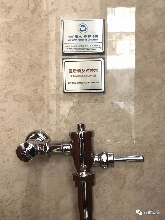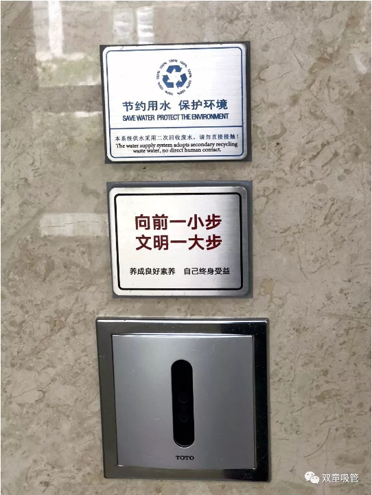 除此之外,“雙童”的衛(wèi)生間內(nèi)還有許多提示引導(dǎo)的標(biāo)示牌,每個(gè)配件都極為精致!在洗手區(qū),統(tǒng)一配備了洗手液,俯身洗手時(shí),你會(huì)看見墻面上溫馨的提示語:“洗手臺(tái)盆,保持清潔;請(qǐng)勿將大量的水濺出臺(tái)盆濺濕地面”;每個(gè)廁所隔間都有“便后請(qǐng)沖水、素養(yǎng)高低往往體現(xiàn)在關(guān)上門自己獨(dú)處之時(shí)”的溫馨提示,引導(dǎo)員工提升個(gè)人素質(zhì)!
