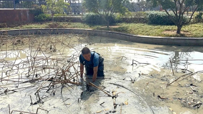 園丁大哥身穿防水服,手拿高壓水槍沖擊淤泥,他彎腰在藕塘里探尋藏在淤泥里的鮮嫩蓮藕,用力一拔,一根一米多長(zhǎng)的藕從淤泥里被拽了出來。