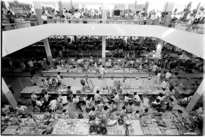這個大膽的設(shè)想在篁園市場得以落地。1992年2月,篁園市場一期開業(yè),內(nèi)設(shè)7100個攤位,主要經(jīng)營日用百貨、針棉、線帶、鞋類、紐扣、眼鏡等大類商品。樓仲平拿出家底2000元,在這租攤位,同朱燕俊一樣,抽到百貨攤位,他們成為了“同行”,甚至是隔壁攤位。