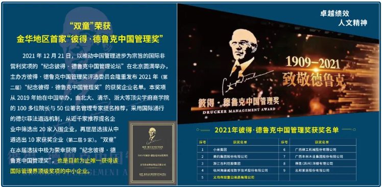 2021年12月21日,“雙童”榮獲金華地區(qū)首家“彼得·德魯克中國(guó)管理獎(jiǎng)”。本獎(jiǎng)項(xiàng)是由北大、清華、浙大等頂尖學(xué)府商學(xué)院的100多位院長(zhǎng)與50位著名管理專家提名推薦,從近千家推薦提名企業(yè)中層層選拔從中遴選出10家獲獎(jiǎng)企業(yè)?!半p童”是目前為止唯一獲得該國(guó)際管理界頂級(jí)獎(jiǎng)項(xiàng)的中小企業(yè)。