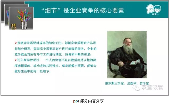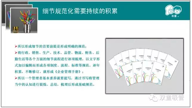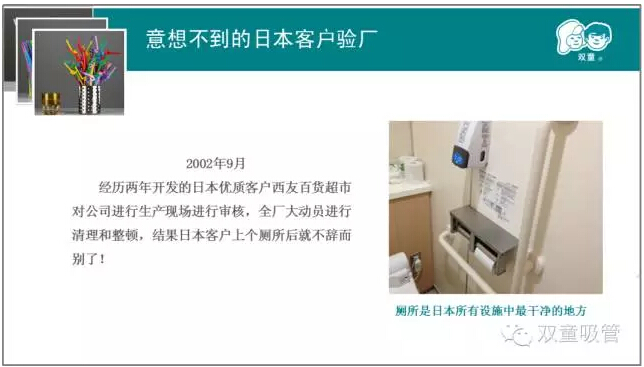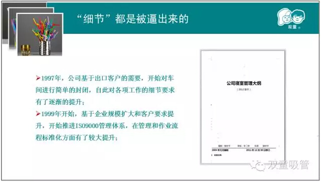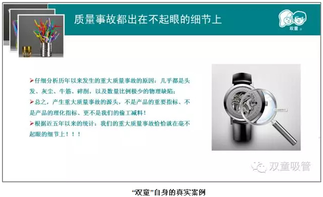 第二章則是本次課程的重中之重。樓總結(jié)合我們“雙童”自身的真實案例,來說明實施精細(xì)化管理對產(chǎn)品質(zhì)量的重要性!通過和日本客戶的合作,我們一次次地提升,一次次地逼著自己做更高的要求和改變,以此來達(dá)到客戶的需求,更通過這些舉措,慢慢地改變我們自己的產(chǎn)品質(zhì)量和員工素質(zhì)。