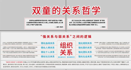 關(guān)系哲學(xué)強(qiáng)調(diào)要擺脫親情和人情的依賴(lài)、強(qiáng)化了規(guī)則和契約的認(rèn)同。在正確理解信息化環(huán)境的彼此訴求下,“雙童”也逐漸建立起科學(xué)規(guī)范的組織關(guān)系:重規(guī)則、守契約、講創(chuàng)造、論績(jī)效、同理心、共成長(zhǎng),引導(dǎo)員工向職業(yè)化思想轉(zhuǎn)變。