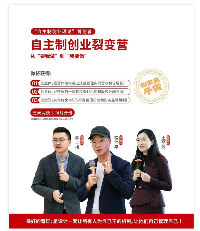 從2021年開始,第五創(chuàng)業(yè)體-雙童商學院,把這套實施了多年的自主制創(chuàng)業(yè)裂變機制變成一堂可復制、可實踐的課程,完全契合中小微創(chuàng)業(yè)者的需求。