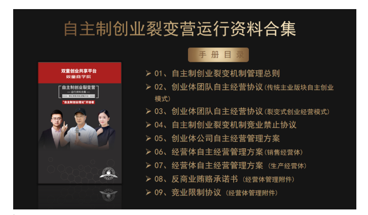3、交付自主制創(chuàng)業(yè)裂變模式的各項規(guī)則、文本、合同等書面資料