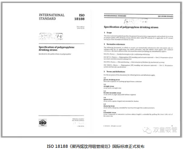 上周一,瑞士日內(nèi)瓦ISO國際標(biāo)準(zhǔn)化組織已正式向全球162個成員國發(fā)布了《聚丙烯飲用吸管規(guī)范》ISO國際標(biāo)準(zhǔn),而這一標(biāo)準(zhǔn)是由義烏市雙童日用品有限公司主導(dǎo)制定的。