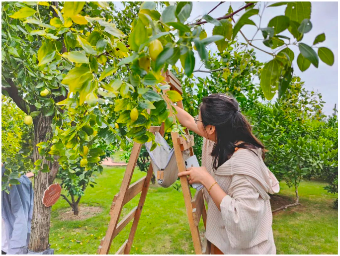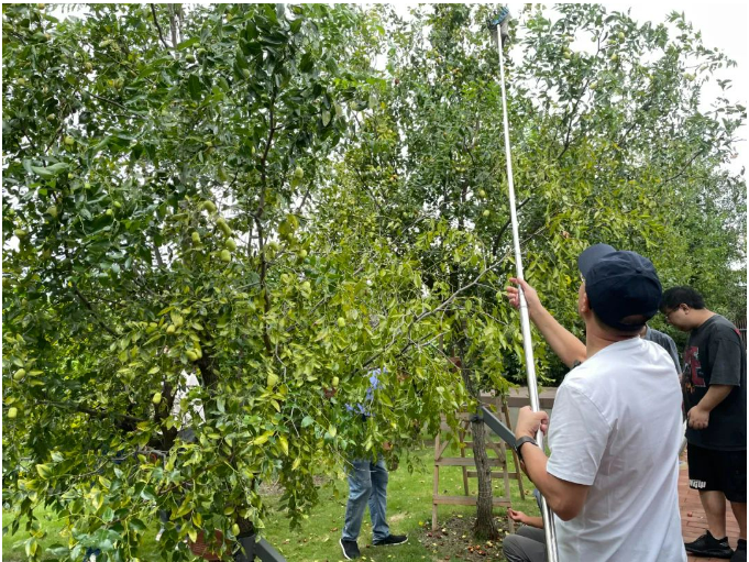 用手搖、用竹竿敲、爬梯子摘、在樹下?lián)炻?/strong>為了能裝滿自己的小籃子,大家也都沒(méi)閑著,“各顯神通”,現(xiàn)場(chǎng)是一片“手忙腳亂”!