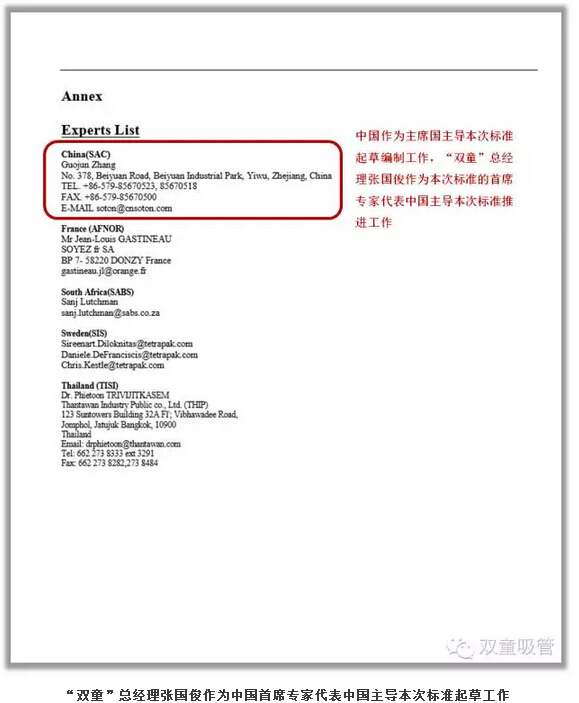 從2008年向ISO國際標(biāo)準(zhǔn)化組織提交ISO《聚丙烯飲用吸管》國際標(biāo)準(zhǔn)的起草申請書,到2016年該組織正式向全球162個(gè)成員國下發(fā)ISO國際標(biāo)準(zhǔn)文本,“雙童”整整努力了9年,先后在6個(gè)國家召開了多次專家討論會,最終“打敗”包括“日本標(biāo)準(zhǔn)”在內(nèi)的全球眾多吸管產(chǎn)品標(biāo)準(zhǔn),拿下“桂冠”,讓全球吸管行業(yè)向中國標(biāo)準(zhǔn)看齊。