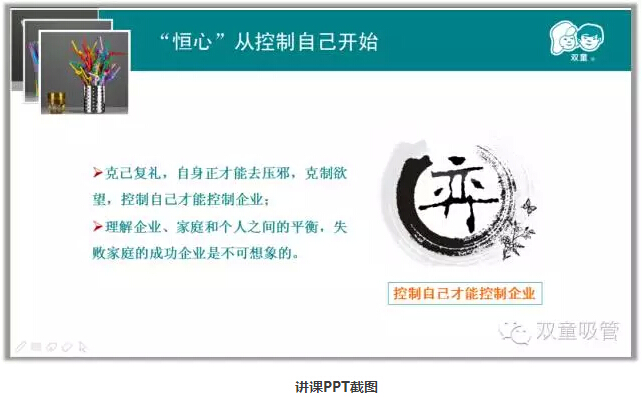 課程正式開始!當(dāng)家人樓總用了兩個多小時的時間,向大家闡述了他經(jīng)營”雙童“二十多年所積累下來的寶貴經(jīng)驗心得。其中,當(dāng)家人樓總重點向大家講述了”雙童“由初心、恒心、平常心組成的”匠人之心“。