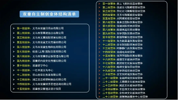目前,我們通過裂變機制用6年的時間,在“雙童”一共做出了15家創(chuàng)業(yè)體公司和26家經(jīng)營體板塊,有40多位員工成為了我們創(chuàng)業(yè)體公司的股東。雙童創(chuàng)業(yè)平臺隊伍日益壯大