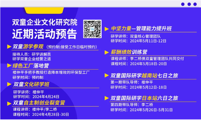 沒(méi)趕上本次《冠軍之旅》的朋友也別擔(dān)心,2024年5月26日,雙童總經(jīng)理李二橋也將帶領(lǐng)30多位企業(yè)家朋友一起,走進(jìn)世界500強(qiáng)企業(yè)、百年長(zhǎng)壽企業(yè)、專(zhuān)精特新企業(yè),深入企業(yè)工廠內(nèi)部,從“細(xì)枝末節(jié)”處考察,全方面學(xué)習(xí)優(yōu)秀經(jīng)營(yíng)理念,助力企業(yè)成長(zhǎng)!