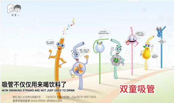 所以早在2004年,“雙童”就打破了“吸管就是喝飲料的”隱含假設(shè),并通過要素拆解和組合去獲得一個(gè)“新組合”,從吸管單一的“喝水”功能向情感化、體驗(yàn)化和娛樂化延伸,使產(chǎn)品售價(jià)和附加值都得到成倍增長,徹底讓“一根吸管”從“不可能”變成了“可能”。在2005年的戶外廣告和會(huì)刊封底廣告中