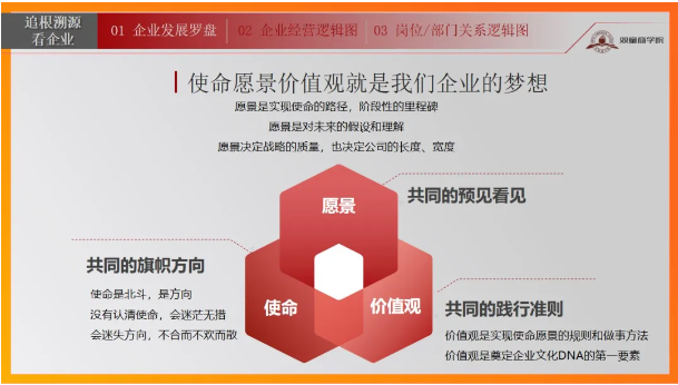 “追根溯源看企業(yè)”旨在讓參訓學員明確自己企業(yè)發(fā)展目標、夢想,并推動目標的實現(xiàn);正確認知企業(yè)經(jīng)營現(xiàn)狀,明確企業(yè)盈利的關鍵點和卡點;掌握科學合理地劃分部門與崗位的依據(jù)和方法。