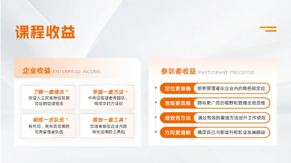 《中堅力量》全課程按照思維有高度、帶人有溫度、做事有力度、成長有速度四個主題分期交付,秉著實用主義的原則,各位老師在課程交付中,不僅拆解原理,還直接給工具、給方法,以幫助參訓企業(yè)全方位的提供管理者綜合素養(yǎng)!