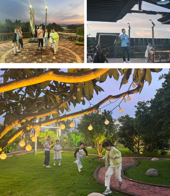 在整場活動中,無論是大朋友、還是小朋友,都很投入,有人在對月當(dāng)歌,有人在舉杯暢飲,小朋友在草坪上恣意奔跑……