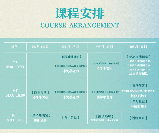 接下來,我們將進(jìn)入【樓仲平隱形冠軍私享會】的下半場學(xué)習(xí),新課題【組織保障】將于6月16日-19日正式開課。準(zhǔn)備工作已就緒,期待各位同學(xué)“回家”!