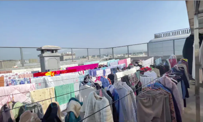 在員工宿舍9樓,“雙童”設(shè)有一個露天洗衣房,這個區(qū)域大約有兩三百平方米。為了應(yīng)對多變的天氣條件,該區(qū)域上方安裝了陽光板。這樣做的原因是為了在晴天時讓陽光充分照射進(jìn)來,使衣物能夠得到充足的日曬,同時在雨天又能防止衣物被淋濕。