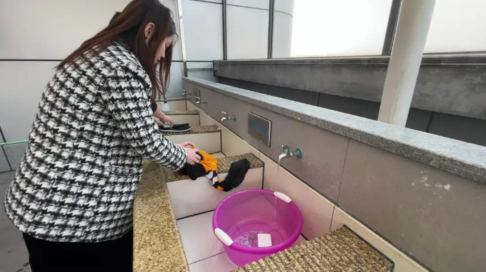此外,為了維護(hù)洗衣房的整潔,“雙童”還設(shè)置了一個落地衣物收集區(qū)。阿姨必須將落地的衣物撿起,放入指定的筐內(nèi)。如果衣物是濕的,則需要特別掛在陽光板下,以便晾干。