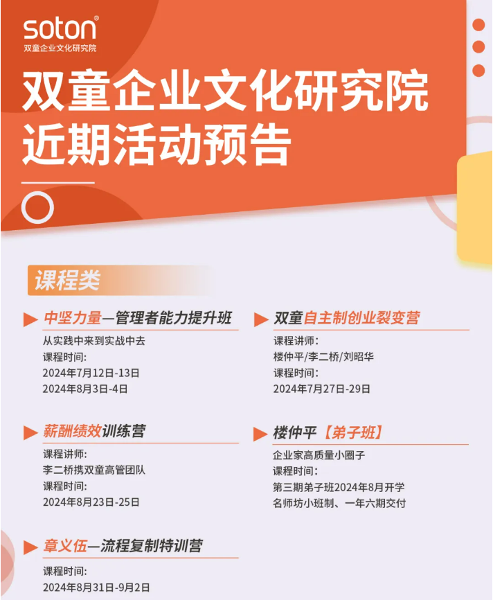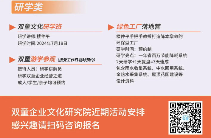 如果你也對“雙童”如何通過精細(xì)化管理引領(lǐng)新風(fēng)尚充滿好奇,渴望為你的團(tuán)隊注入成長的新動力,歡迎走進(jìn)7月18日【雙童文化研學(xué)班】,與上百位優(yōu)秀的創(chuàng)業(yè)者一起學(xué)習(xí)!少量名額,歡迎咨詢鎖定!