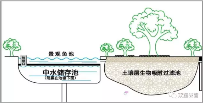 中水景觀池的精髓蘊含于其命名之中,“中水”實則源自“雙童”廠區(qū)內(nèi)部經(jīng)過處理的生活廢水。值得注意的是,這些廢水并非直接呈現(xiàn)為我們眼前所見的池水景象,而是巧妙地存儲于景觀池下方的特定中水儲存池中。