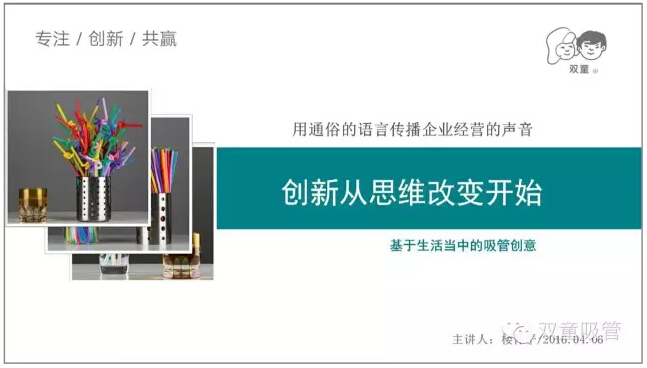每年四月份,我們的當(dāng)家人樓總就在學(xué)習(xí)會中給員工們分享了《創(chuàng)新從思維改變開始》的課程,鼓勵員工們多多創(chuàng)新,動員大家多多參與到即將舉辦的首屆吸管創(chuàng)意大賽中。他說,全球最頂尖的吸管一定在“雙童”,沒有人比我們更了解吸管,相信員工們一定可以提交上來非常棒的創(chuàng)意作品!