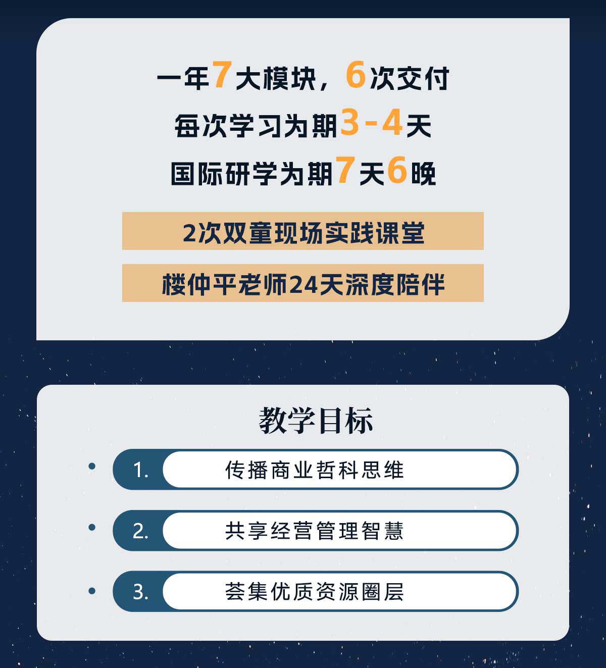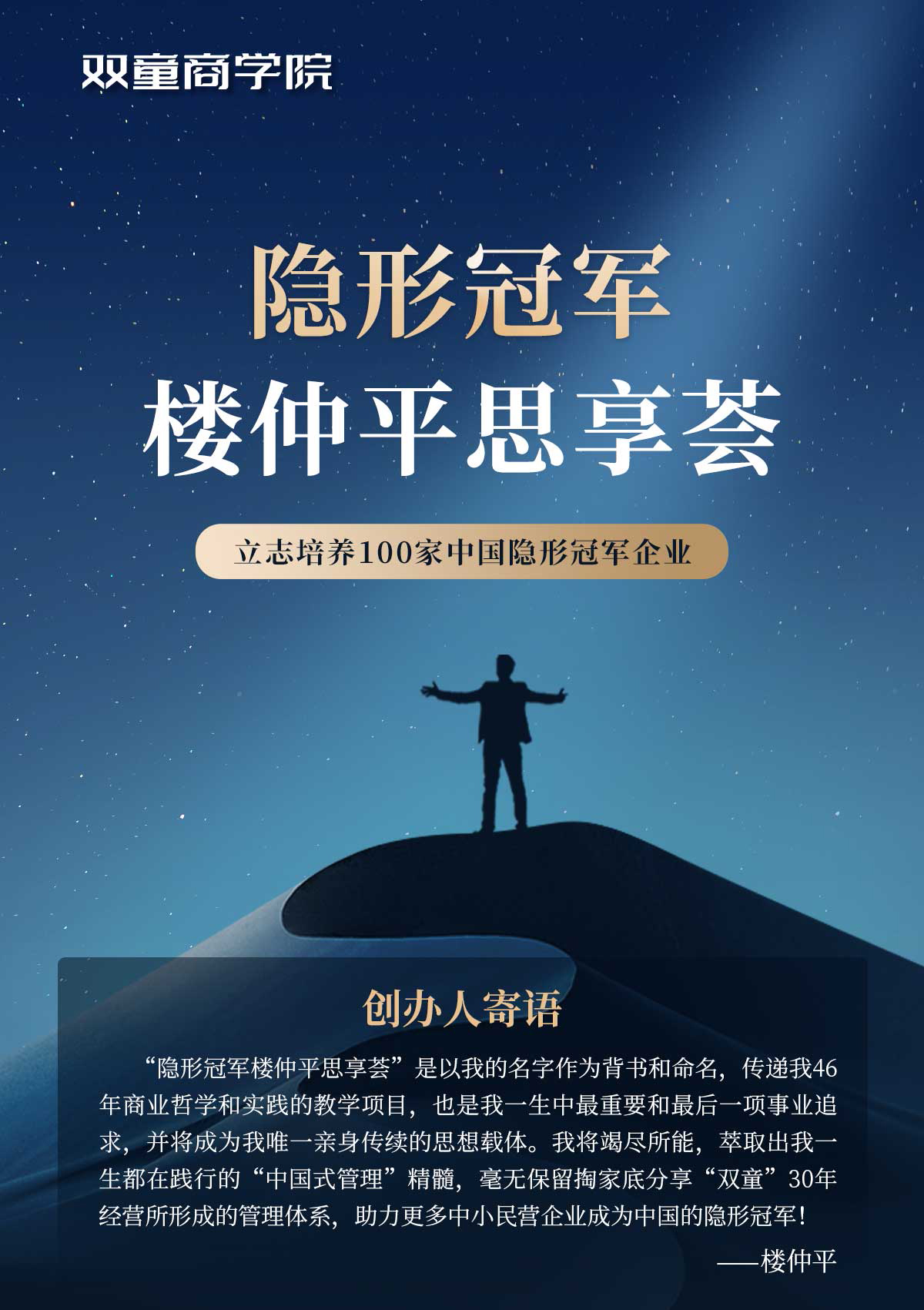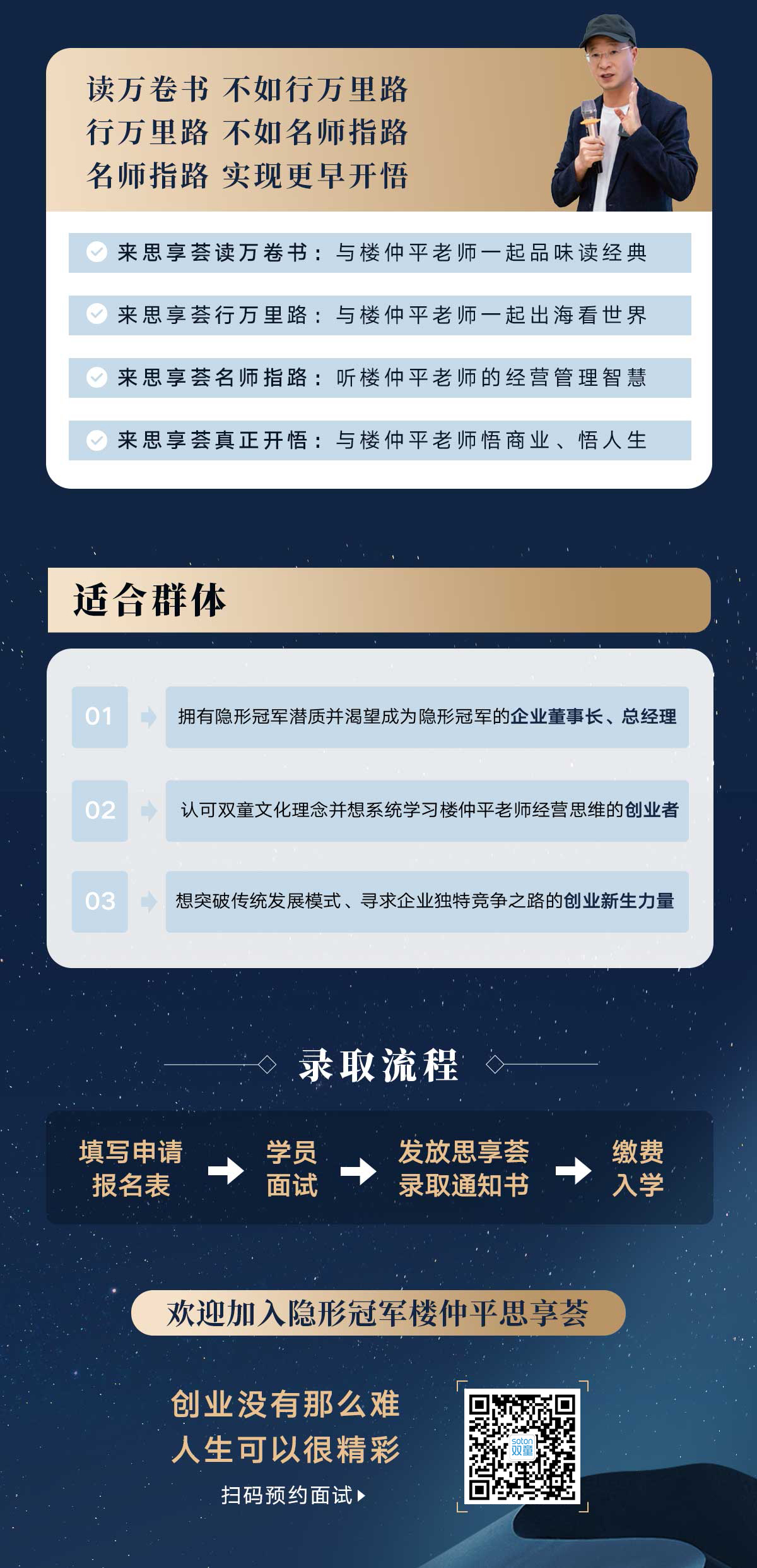 如果你是創(chuàng)業(yè)者、學(xué)習(xí)者、思想者,希望在經(jīng)營領(lǐng)域有自己的思考和洞察,那么《隱形冠軍樓仲平思享薈》就是為你量身定制,今年最后一期招生,一班只招40位同學(xué),名額所剩不多,抓緊機會哦!
